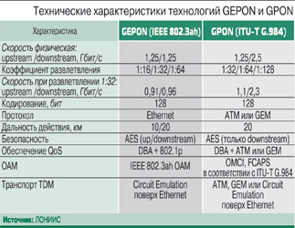 Отметим, что в разных источниках, в целом одинаково определяющих GPON, по-разному описаны возможности GEPON3, 4. Наиболее серьезные разночтения встречаются при определении коэффициента разветвления, покрываемого расстояния, поддержки механизмов обеспечения QoS, безопасности и технической эксплуатации (OAM) (см. таблицу).