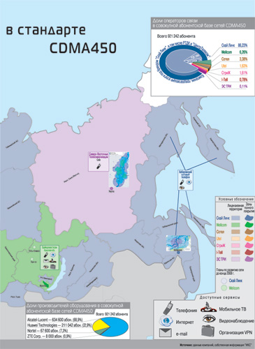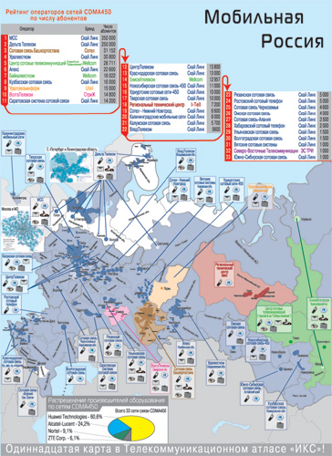 Стандарт подвижной радиотелефонной связи IMT-MC-450 Россия официально признала одной из первых в мире – в 2002 г. В том же году сеть связи этого стандарта запустил в коммерческую эксплуатацию в Санкт-Петербурге оператор «Дельта Телеком». С 2003 г. началось продвижение CDMA2000 вглубь страны. Чтобы наглядно показать читателям, как далеко ему удалось «зайти» за эти 5 лет, мы, основываясь на информации операторских компаний и открытых источников, подготовили карту «Мобильная Россия в диапазоне 450 МГц». На карте отражена лицензионная территория операторов сетей подвижной радиотелефонной связи стандарта CDMA450 в РФ, показано покрытие России их сетями и перспективы его расширения до конца 2008 г., выделены поставщики сетевого оборудования для этих сетей, доступные абонентам сервисы и количество абонентов.Операторы: 8 + 25