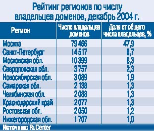 В 2004 г. рост владельцев доменов составил почти 74%. На 31 декабря 2004 г. почти 166 тыс. компаний и частных лиц владели доменами в национальной доменной зоне (в 2003 г. – 95 тыс.). В 15 регионах число владельцев доменных имен перевалило за 1000.
