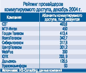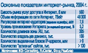 По оценкам «iKS-Консалтинг», в 2004 г. доходы от предоставления услуг доступа в Интернет в России увеличились по сравнению с 2003 г. почти в 2 раза и составили порядка $560 млн. Этому способствовали рост числа пользователей (в том числе региональных), рост потребляемого IP-трафика, физический рост сетей ПД, активное продвижение услуг широкополосного доступа. На декабрь 2004 г. число регулярных (недельных) пользователей увеличилось по сравнению с декабрем 2003 г. на 29% и достигло 7,6 млн. Как результат, охват регулярной недельной интернет-аудитории составил 5,3%. Крупнейшим интернет-рынком остается Москва, однако ее доля в общем объеме интернет-пользователей продолжала падать и составила на конец года порядка 36%.