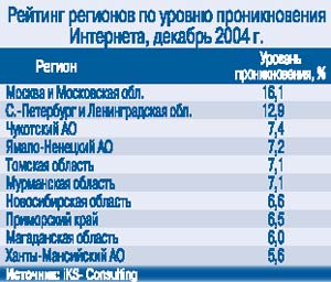 В первую десятку регионов с наибольшим уровнем проникновения интернетуслуг вошли промышленные регионы с высокой плотностью городского населения, в частности Мурманская и Магаданская области (по 92%), ХМАО (91%). Объем информации, переданной по Сети, увеличился, по оценкам «iKS-Консалтинг», почти на 200%, с 16 345 Тбайт в 2003 г. до 48 300 Тбайт в 2004 г. Причем на долю традиционных операторов в суммарном входящем/исходящем трафике пришлось менее 5%, т. е. на 2 процентных пункта меньше, чем в 2003 г.