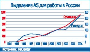 Темпы развития российских провайдеров характеризуются как числом их пользователей, так и динамикой выделения номеров автономных систем (AS). В последние два года наблюдается бурный рост провайдерского сегмента телекоммуникационного рынка. На конец 2004 г. порядка 2 тыс. ISP предоставляли услуги доступа в Интернет.