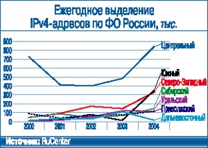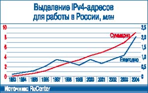 Количество интернет-ресурсов стабильно росло. Число «активных» сайтов, по данным Rambler’s Top 100, увеличилось на 18% (в 2003 г. – 16%), превысив 134 тыс. В 2004 г. наблюдалось ускорение развития сетевой инфраструктуры Интернета. Российским компаниям, имеющим статус LIR, было выдано рекордное число IP-адресов – более 2 млн.