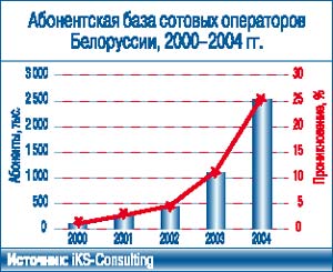 По прогнозам «iKS-Консалтинг», в 2005 г. абонентская база сотовых операторов в Белоруссии может превысить 3 млн, а уровень проникновения – 30%. Однако все это будет происходить с участием только одной российской компании – МТС. . До изменения политической ситуации в стране выход на белорусский рынок других российских операторов – «ВымпелКома» и «МегаФона» – представляется весьма сомнительным.
