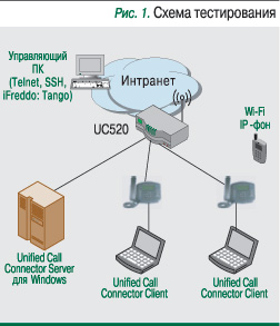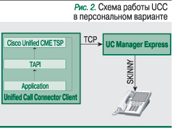 Возможны два варианта использования UCC – персональный (рис. 2) и клиент-серверный (рис. 3). В первом случае клиентское приложение UCC представляет собой TAPI-драйвер, с которым через UC500 взаимодействует телефонный аппарат. Приложение «отслеживает» всю сигнальную информацию, что обеспечивает «управление вызовами».