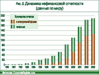 Нефинансовые отчеты появились в начале 90-х и, как правило, были посвящены экологическим вопросам. С каждым годом количество отчетов стремительно возрастало, и они становились все содержательнее. Если в 1993 г. было издано около 50 отчетов (рис. 3), то в 1999 г. эта цифра увеличилась более чем в 10 раз. В 2003 г. было выпущено свыше 1800 отчетов, как в печатной, так и в электронной форме. Первым таким отчетом в телекоммуникационной отрасли стал экологический отчет British Telecom.