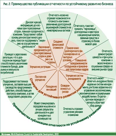 Как уже отмечалось, вначале одной из основных причин внедрения принципов корпоративной ответственности было внешнее давление на компании, исходящее от инвесторов, государственных органов власти, неправительственных организаций и других заинтересованных сторон. Сегодня компании видят и другие стимулы и преимущества устойчивого развития. Одно из видений таких преимуществ показано на рис. 2.