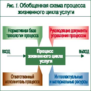 Поскольку любой процесс, осуществляемый людьми, – это совокупность взаимосвязанных ресурсов и деятельности, которые преобразуют вход в соответствующий выход процесса, то общую модель процесса жизненного цикла услуги можно представить в виде обобщенной схемы (рис. 1)