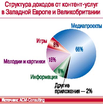 С. БОРИСОВ: Вид контента жестко привязан к глубине проникновения рынка сотовых телефонов. Вплоть до сего времени россияне в основном выбирали недорогие модели, зачастую с черно-белым экраном и монофоническим типом звонка, что сдерживало развитие рынка. Относительно недавно стали доступными по цене модели с цветными экранами, полифоническими звонками, доступом к WAP-и web-ресурсам, что заметно повлияло на общее предложение сервисов – они стали красочнее, богаче по содержанию и ассортименту. Вне зависимости от типа терминала бесспорными лидерами по объему продаж являются «Мобильные знакомства», доставка логотипов и рингтонов, за ними следуют Java-приложения – игры или слайд-шоу эротического содержания.