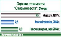 В борьбе за телекоммуникационный холдинг пересеклись интересы финансовых колоссов. Одна сторона – консорциум Mustcom: В. Потанин ( «Интеррос» ) и Дж. Сорос; другая – консорциум Б. Березовский, «АльфаГрупп» и В. Гусинский (группа «Мост» ). Право приобрести 25% +1 акция «Связьинвеста» выиграл Mustcom, заплативший за это $1,875 млрд, что на 60% превышало первоначальную цену пакета ($1,18 млрд). Спустя несколько лет великий финансист Дж. Сорос назовет это приобретение «самой худшей инвестицией в своей жизни». В первой половине 2004 г. консорциум Mustcom был куплен Access Industries за $625 млн, т. е. в 3 раза (!) ниже первоначальной цены 1997 г. Это стало первой инвестицией в телекоммуникационные активы компании, ранее известной своим совместным с «Альфа-Групп» и «Реновой» – ТНК проектом в нефтегазовом секторе. В начале 2003 г. партнеры продали 50% акций ТНК международной нефтегазовой корпорации BP почти за $7 млрд (доля Access Industries cоставила около $1, 75 млрд). И, как мы предполагаем, именно из этих средств Access Industries профинансировала покупку консорциума Mustcom. Следует заметить, что партнерство Access Industries с «Альфа-Групп» в нефтегазовом бизнесе не было продолжено в телекоммуникационном.