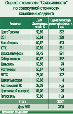 Оценка «Связьинвеста», с одной стороны, упрощается тем, что это холдинг, основные активы которого обращаются на фондовом рынке. Если исходить из того, что фондовые рынки есть модель совершенного рынка, где механизм спроса и предложения определяет справедливую равновесную цену, именно рыночная оценка и будет искомой.