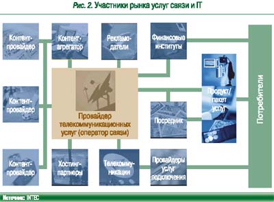 Современная сеть не зря называется инфокоммуникационной. В оказании услуг связи участвуют самые разнообразные компании (рис. 2). Наряду с компанией-оператором, у которой остаются функции предоставления ресурсов для передачи пакетного трафика сервисов, есть провайдеры услуг и провайдеры контента, агрегаторы контента и хостинг-провайдеры, провайдеры подключения и посреднические компании. Можно с уверенностью сказать, что взаимодействие всех компаний-участниц между собой будет эффективным только при наличии четко разграниченных сфер деятельности и надежного механизма взаиморасчетов, по возможности – в реальном времени.