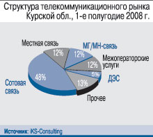По предварительным оценкам, в 2008 г. доход от услуг связи в Курской области составит $200 млн – это всего лишь 14-е место среди регионов Центрального федерального округа. Растет местный рынок связи практически теми же темпами, что и российский телеком в целом – около 21% в год.Почти половина рынка – за операторами сотовой связи. Здесь в полном составе присутствует «большая тройка», но действует и четвертый по значению игрок России – Tele2, как известно, умеющий получить свой кусок пирога на рынке. Ожидается, что курский сотовый пирог в нынешнем году потянет на $90–100 млн.