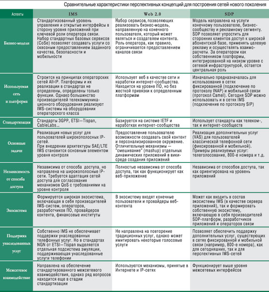 Концепции IMS, Web 2.0 и SDP часто противопоставляют друг другу, учитывая отмеченные выше различия. Представляется, однако, что при трансформации существующих сетей в сети нового поколения, в которых жизненные циклы услуг будут намного короче, а оператор связи будет полноценным игроком на рынке услуг, все они найдут себе применение.