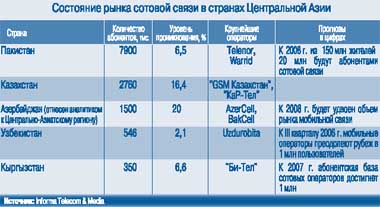 Из выступления второго докладчика, К. Таубмена, участникам конференции стало известно, что телекоммуникации составляют 8% в кредитном портфеле ЕБРР (его общий вес – $1,2 млрд). Традиционно структура инвестиций в эту отрасль такова: 36% выделяется в виде кредитов на развитие фиксированной связи, 35% инвестируется в связь мобильную и 24% идет на поддержку бизнеса компаний, работающих в сфере медиа. По данным старшего аналитика агентства Informa Telecom &Media К. Манна, на конец 2004 г. в мире насчитывалось 1,81 млрд пользователей сотовой связи, из них 39,2% проживают в Азии (в Западной Европе – 24,6%; в США и Канаде – 11,9%; в ЦВЕ – 9%). Среди стран Центральной Азии по количеству абонентов лидирует Пакистан, на втором месте – Казахстан, на третьем – Азербайджан, от которого ненамного отстает Узбекистан (см. таблицу). В целом рынки мобильной связи стран региона отличают быстрые темпы роста объемов (от 60 до 100% в год)и низкий уровень проникновения сотовой связи вследствие высокой численности населения (16,4%, достигнутые Казахстаном, – это максимум). Услуги связи предоставляют операторы сетей стандартов TD-AMPS, GSM, CDMA2000, в капитале которых высока доля зарубежных акционеров.