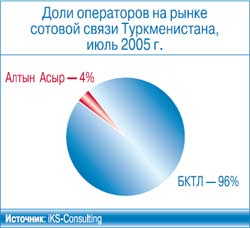 Однако в 2004 г. БКТЛ утратила свое монопольное положение. Для развития национальной сети сотовой связи стандарта GSM была создана компания «Алтын Асыр» («Золотой век»), которая является структурной единицей государственной компании электросвязи «Туркментелеком». В настоящее время на ее счету всего лишь 2,5 тыс. абонентов.