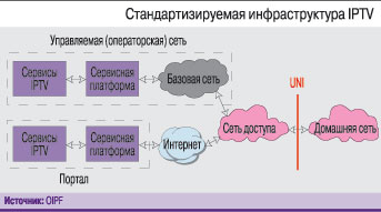 Стандартизация в рамках деятельности OIPF единого для операторских сетей и Интернета интерфейса «пользователь–сеть» (User-Network Interface – UNI) позволит гарантировать совместимость абонентских устройств и сервисов IPTV разных провайдеров, соответствующих спецификациям OIPF (см. рисунок). Сегодня абонентское устройство IPTV, как правило, привязано к сервисам конкретного провайдера, что затрудняет его замену и подписку на новые услуги. Совместимость таких устройств с видеосервисами Интернета (с возможностью просмотра их контента на экране ТВ) и разных телеком-операторов ускорит развитие рынка услуг IPTV, поспособствует увеличению производства абонентского и инфраструктурного сетевого оборудования. В январе текущего года OIPF опубликовала спецификации Release 1 IPTV Solution Specifications, в которых определены медиаформаты, метаданные контента, протоколы ряда интерфейсов (домашней сети, UNI и межсетевого) и прикладные среды, представлены механизмы аутентификации пользователей и защиты контента. Совместно с техническими профилями, которые планируется обнародовать весной, названные спецификации помогут компаниям развертывать совместимые IPTV-решения, что упростит пользование услугами IPTV. Разработчики спецификаций подчеркивают важную роль IMS (IP Multimedia Subsystem) в интеграции IPTV-сервисов c коммуникационными услугами. Стандарты организации DLNA (Digital Living Network Alliance) выбраны ими в качестве основы для организации распределения и хранения контента в домашней сети.