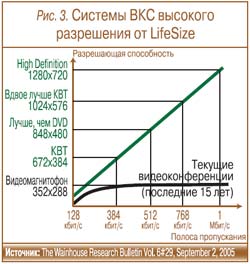 Второй нарушитель спокойствия, американская компания LifeSize Communications, в середине 2005 г. анонсировала пакет стандартизованных продуктов, ориентированных на ВКС высокого разрешения (HD) и совместимость с уже внедренным оборудованием конкурентов. Представленная линейка состоит из двух систем ВКС, поддерживающих High Definition, конференц-телефона, шлюза для подключения к ISDN и системы управления с поддержкой сторонних производителей (Polycom и Tandberg). Особый упор LifeSize делает на то, что они предлагают в 10 раз большую производительность практически за те же деньги, что и оборудование, представленное на рынке. Сегодня доступны только система управления LifeSize Control, конференц-телефон LifeSize Phone и кодек LifeSize Room (ноябрь 2005 г. ), а появление терминала Exec и шлюза Networker ожидается только через несколько месяцев.