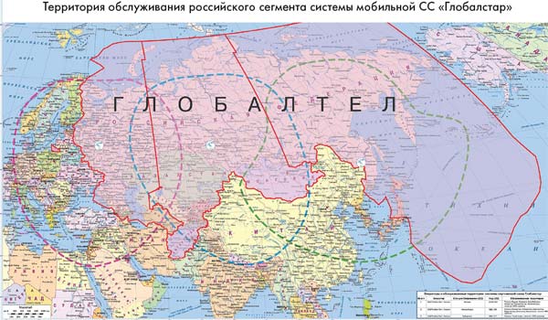 Низкоорбитальная система персональной подвижной спутниковой связи (ППСС) Globalstar действует на территории России с 2000 г. Космический сегмент состоит из 48 КА на круговых орбитах высотой 1414 км. Спутники оснащены простыми ретрансляторами массой 450 кг без обработки сигналов; срок жизни – 7,5 года и более. Для связи с абонентами в диапазонах L (1610–1626,5 МГц, линия «вверх») и S (2483,5–2500 МГц, линия «вниз») используются активные антенные решетки, формирующие 16 лучей. Межспутниковые линии связи не предусмотрены. Принятый поток ретранслируется на Землю с помощью рупорных антенн в С-диапазоне: 6875,95–7052,9 МГц (передача) и 5091–5250 МГц (прием). У Globalstar свыше 25 станций сопряжения по всему миру; три из них в России (Москва, Новосибирск, Хабаровск).