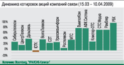 Стабилизация конъюнктуры на мировых финансовых рынках, укрепление рубля и рост цен на нефть способствовали перемене настроений на российском фондовом рынке. Российские индексы за период с 15 марта по 10 апреля преодолели психологически важные отметки 800 пунктов по индексу РТС и 900 – по индексу ММВБ. Акции телеком-компаний в среднем росли быстрее рынка, а индексы РТС-телекоммуникации и ММВБ-телекоммуникации продемонстрировали рекордный за прошедший год рост.