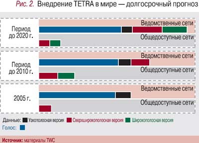 В 2005 г. технический комитет TETRA занимался завершением трех работ в рамках спецификаций TETRA Release 2 (T2), заявленных еще в 2001 г. (рис. 1).Первая (Air-Groud-Air, AGA) – развитие и оптимизация спецификаций радиоинтерфейса TETRA с целью расширения зоны действия TETRA-системы в режиме TMO (Trunked Mode Operation – режим транкинга) и снижения стоимости развертывания систем подвижной профессиональной связи для служб безопасности морского и воздушного транспорта, а также для организации сельской телефонной связи и «линейной» – вдоль нефте- и газопроводов.