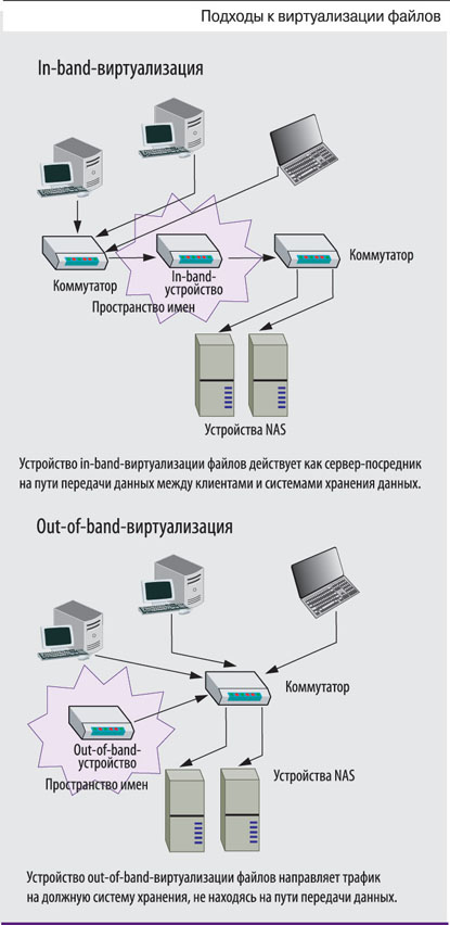 Средство out-of-band-виртуализации представляет собой устройство, подключаемое к коммутатору. Оно просматривает трафик систем хранения и посредством пространства имен направляет данные на должную систему, но не перехватывает каждый передаваемый пакет. К out-of-band-продуктам относятся StorageX фирмы Brocade и Rainfinity компании EMC. Последняя позиционирует устройство Rainfinity в качестве гибридного решения для виртуализации файлов. Дело в том, что обычно его устанавливают вне пути передачи данных, но в рамках определенной политики оно может действовать и как in-band-устройство.