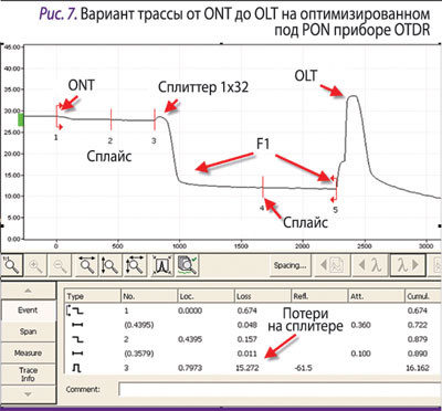 Применение OTDR для контроля сетей FTTx требует тщательной настройки измерений и оптимизации прибора под задачи указанных сетей. Причиной тому – широкое применение в сетях FTTx (в первую очередь в сетях PON) кабельных систем древовидной топологии. Если OTDR не оптимизирован под задачи тестирования PON, сигналы от разных «плеч» древовидной системы могут мешать друг другу, в результате чего полученные трассировки рефлектограмм окажутся бесполезными. На измерениях отрицательно сказывается и присутствие сплиттеров в тестируемом канале. Потери тестового оптического сигнала в процессе его отражения на сплиттере приводят к появлению характерной «ямы» на рефлектограмме, так что рефлектометр должен иметь достаточный динамический диапазон для отображения состояния кабеля после сплиттера.