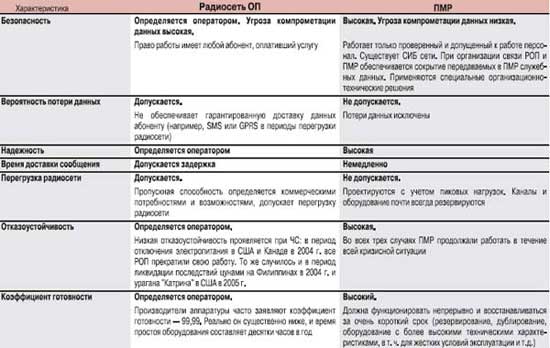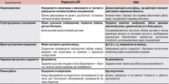 Сравним оперативные характеристики ПМР (транкинговых и конвенциональных радиосетей служб общественной безопасности, промышленности и транспорта, вооруженных сил) и РОП (GSM, CDMA, в значительной части DECT и Wi-Fi).