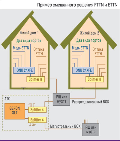 На практике интерес может представлять смешанное решение, сочетающие принципы FTTH и технологию подключения пользователя по сети Ethernet на основе медножильной проводки (ETTH). В этом случае к установленному в распределительном шкафу (внутри здания) сплиттеру подключаются как индивидуальные устройства ONT, так и многопользовательское устройство MDU ONT. К MDU ONT по меди (технология Ethernet) подсоединяются устройства абонентов.