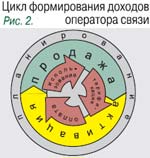 Потери оператора при предоставлении услуг неразрывно связаны с процессами получения доходов. В цепочку формирования доходов входят: планирование, продажа услуги, ее подключение и активация, оказание услуги, разбор информации о фактах оказания услуги, тарификация услуг, начисление, выставление счетов и сбор платежей. Заметим, что последовательность этапов формирования доходов не совсем линейна и может быть разбита на фазы: планирование, подключение, генерация дохода. В реальных условиях интенсивность операций возрастает от фазы к фазе, и цепочка превращается в цикл (рис. 2). Очевидно, что цикл «использование услуги–оплата» протекает интенсивнее цикла планирования, а ошибки и сбои, допущенные на первых этапах (при планировании или продаже), проявятся на последующих. При этом можно утверждать, что ошибка на стадии оказания услуги носит случайный характер, а при планировании – уже общесистемный (например, неверно составленный тарифный план может оказаться убыточным