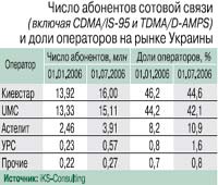 Лидером по числу абонентов в Украине (таблица) попрежнему остается «Киевстар», который еще больше увеличил отрыв от основного конкурента – компании UMC, утратившей лидерство не только по абонентской базе, но и по количеству новых подключений. Если в I квартале 2006 г. на долю UMC приходилось более 37% общего количества новых подключений на рынке, то во II квартале – около 24%. Соответственно уменьшилась и рыночная доля оператора – до 42% в конце полугодия против 44% в начале года.