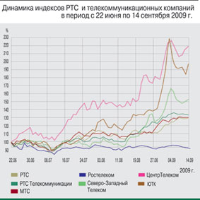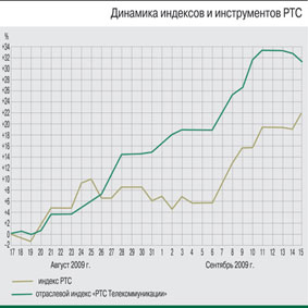 Мировые фондовые рынки неохотно реагировали на существующие факторы риска, сопутствующие их росту, ориентируясь главным образом на ожидания скорейшего восстановления экономики. Нефтяные котировки за прошедший месяц продемонстрировали незначительное снижение на уровне $2,46 (до $69,71 за баррель), что воспринималось инвесторами скорее как признак стабилизации рыночной конъюнктуры. Дополнительным драйвером роста котировок отечественного фондового сегмента стало определенное обесценение доллара по отношению к ряду мировых валют, в том числе на 2,71% к рублю.На этом благоприятном фоне в период с 17 августа по 15 сентября индекс ММВБ вырос на 16,28% и достиг 1203,97 пункта. Индекс РТС, в свою очередь, увеличился на значимые 21,73%, составив в итоге 1224,33 пункта. Как и раньше, котировки акций компаний телекоммуникационного сектора продолжали демонстрировать динамику лучше рынка в целом, отыгрывая позитивную рыночную конъюнктуру и некоторые отраслевые события. В результате отраслевой телекоммуникационный индекс ММВБ – MICEX TLC – за месяц вырос на 29,38% (до уровня 1493,01 пункта), а индекс «РТС Телекоммуникации» – на 31,44%, достигнув, таким образом, 157,83 пункта.