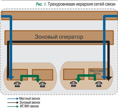 Сегодня применяется трехуровневая структура сетей связи, включающая местный, зоновый и МГ/МН-уровни. Совершаемый звонок должен последовательно проходить соответствующие уровни: местная сеть > зоновая сеть > местная сеть в случае внутризонового звонка, местная сеть > зоновая сеть > МГ/МН-сеть > зоновая сеть > местная сеть в случае междугородного звонка и зарубежная сеть > МГ/МН-сеть > зоновая сеть > местная сеть в случае международного звонка (рис. 1).