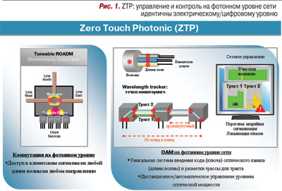 В результате проведенных исследований для предотвращения блокирования оптического канала было предложено устройство colorless ROADM, в котором любой пользовательский порт может быть использован для организации канала с любой длиной волны оптического излучения. На следующем этапе были применены directionless ROADM, в которых к любому порту любого направления передачи может быть адресован оптический сигнал на любой длине волны. Ввод/вывод соответствующего канала по любому направлению осуществляется автоматически, без нарушения баланса в оставшихся оптических каналах, передаваемых через узел насквозь. Такая концепция в сетевых решениях Alcatel-Lucent получила название Zero Touch Photonic (ZTP) – сеть, перестраиваемая посредством системы управления, т.е. без «ручного» вмешательства персонала на узлах (рис. 1).Наличие в узлах WDM-сети colorless & directionless T&ROADM-систем является обязательным условием реализации функциональности ASON/GMPLS на фотонном уровне сети.