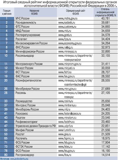 Оценка открытости федеральных органов исполнительной власти. Тем временем санкт-петербургский Институт развития свободы информации, главный оплот россиян по части легальной борьбы за открытость информации о деятельности федеральной власти, опубликовал свой ежегодный рейтинг информационной открытости федеральных органов исполнительной власти России за 2006 г. (см. таблицу), который он составляет начиная с 2004 г. По мнению специалистов института, официальный сайт органа госвласти – это не просто атрибут современной политики, а самое эффективное средство распространения официальной информации о его деятельности. По содержанию официальных сайтов органов власти можно судить об уровне открытости/закрытости каждого органа власти и государства в целом, возможностях граждан в доступе к информации из государственных информационных ресурсов, прозрачности управленческих решений и процедур, а также о предрасположенности того или иного ведомства к коррупции. Если в ноябре 2004 г. 54 федеральных органа исполнительной власти (ФОИВ) не имели своих сайтов, то сегодня таких ведомств осталось всего 2.