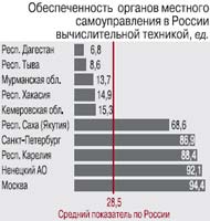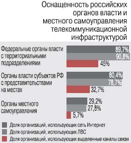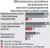 Особенно проблемной зоной с точки зрения обеспеченности ПК и сетевыми технологиями являются органы местного самоуправления. Динамика последних трех лет показала, что при сохранении нынешних темпов роста доступа к ИКТ органы местного самоуправления в России достигнут 100%-ной оснащенности компьютерами – к 2019 г., а доступа в Интернет – к 2020 г. Только к 2110 г. все они будут иметь собственные официальные сайты.