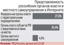 Веб-представительства не стали пока распространенным инструментом органов госвласти и местного самоуправления России для информирования и взаимодействия с потребителями муниципальных и госуслуг. Создание сайтов органами местного самоуправления вообще находится на зачаточном уровне. У федеральных и региональных органов власти дела идут существенно лучше, особенно если рассматривать их без территориальных подразделений и представительств на местах, но в отличие от органов власти всех уровней в странах ЕС и многих других государств они еще далеки от 100%-ного присутствия в Интернете (см. графики).