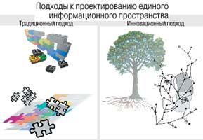 Новая парадигма эволюционного развития единого информационно-функционального пространства принципиально отличается от традиционных подходов к созданию единых информационных полей методом комплексирования разрозненных фрагментов (см. рисунок).