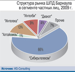 Б'ольшая часть абонентов ШПД сосредоточена в Барнауле – на конец 2009 г. их было уже около 61 тыс., а уровень проникновения приблизился к 30%. Две трети барнаульских широкополосных подключений обслуживает «Сибирьтелеком», предоставляющая услуги доступа в Интернет по технологии xDSL. До недавнего времени характерной чертой рынка ШПД Барнаула являлось отсутствие крупных федеральных игроков. Однако в 2009 г. ситуация начала меняться: местный провайдер «Интелби» стал партнером компании «ТрансТелеКом» в рамках реализации стратегии последней по выходу на розничный рынок ШПД. Кроме того, в конце 2009 г. «ЭР-Телеком», один из наиболее динамично развивающихся альтернативных операторов России, заявил о намерении запустить в 2010 г. собственную оптоволоконную сеть в Барнауле.