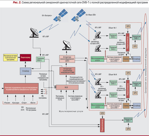 Добавление местных вставок или местного ТВ-канала требует отдельного распределения транспортного потока для каждого региона и, соответственно, расходования дополнительной полосы частот независимо от схемы построения транспортных сетей, поскольку при этом необходима организация приема цифровых ТВ-программ со спутников, ремультиплексирование и формирование региональных мультиплексов наземного цифрового ТВ-вещания.