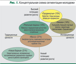 Для молодых людей в любом возрасте важно чувствовать себя уверенно, а для этого им необходимы деньги и одни и те же вещи: одежда, мобильный телефон, автомобиль или мотоцикл. Тем не менее 16–20-летние говорят об одежде и мобильных телефонах почти вдвое чаще, а о хорошей работе – значительно реже, чем группа 21–26 лет, а представители сегмента 16–20 лет при покупке обращают внимание на марку товара чаще, чем их старшие товарищи.
