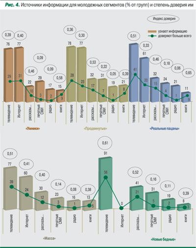 Среди «умников» наиболее популярна деловая пресса («Деньги», «Ведомости», «Известия», «Коммерсантъ» и т.п.) – 14% и общеполитическая пресса (The Times, «Профиль», «Русский репортер», «Русский Newsweek» и др.) – 13%. «Продвинутые» больше внимания уделяют изданиям «желтой» прессы – 24% («Аргументы и факты», «Комсомольская правда», «Московский комсомолец», «Жизнь»), а также женским/девичьим изданиям – 34% («Караван истории», «Лиза», Cosmopolitan, «Домашний очаг», Elle). В сегменте «реальных пацанов» 40% респондентов читают прессу, посвященную автомобилям и спорту («Советский спорт», «Автомир», «За рулем»).