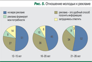 Отношение к рекламе с возрастом становится более прагматичным. Реклама воспринимается как источник информации, средство формирования потребностей, но уровень доверия к ней не растет. «Умники» относятся к рекламной информации более лояльно, чем другие группы молодежи, воспринимая ее во многом инструментально. Наиболее нелояльной по отношению к рекламе является «масса»: более половины из них (54%) не верят рекламе, менее трети (31%) полагают, что