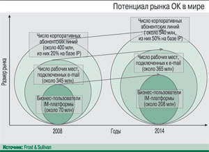 В России объем рынка ОК пока невелик: по данным Frost & Sullivan, в 2009 г. он составил порядка $2 млн. Подобными решениями сегодня интересуются крупные и средние компании, имеющие географически распределенную филиальную сеть и/или штат часто разъезжающих сотрудников. Другая группа пользователей – это молодые, бурно развивающиеся российские компании с новой бизнес-культурой. Каждая такая компания может приобретать не менее сотни лицензий.
