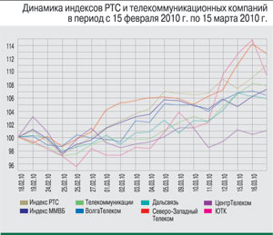 Акции «Волгателекома» подорожали на 9,10% до отметки 106 руб. на фоне отсутствия значимых корпоративных новостей. В то же время бумаги «Уралсвязьинформа» прибавили за этот месяц 7,65% (до 0,928 руб.). Чистая прибыль компании в 2009 г. составила 4 млрд руб. (прирост на 48,7%). Из важнейших корпоративных новостей следует отметить сообщение о том, что Александр Власов с 1 марта 2010 г. займет должность заместителя генерального директора – директора Межрегионального филиала сотовой связи «Уралсвязьинформа» сроком на два года. На новый двухлетний срок продлены и полномочия заместителя генерального директора по корпоративному развитию «Уралсвязьинформа» Дмитрия Самойлова , у которого 2 марта истекает срок прежнего трудового договора.