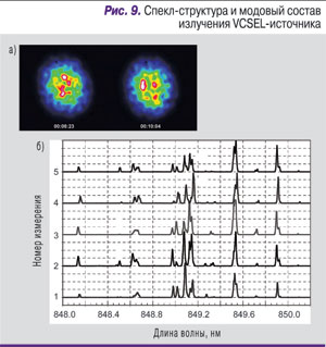 В случае использования VCSEL-источника первый фактор присутствует. Кроме того, измерения спектральной ширины и модового состава излучения VCSEL-источника при помощи прецизионного оптического спектроанализатора показывают, что с течением времени происходит перекачка мощности между различными поперечными модами излучения, а также изменяется состояние поляризации излучения (рис. 9, б). Таким образом, присутствует и третий фактор возникновения модового шума.