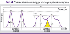 Вследствие межмодовой дисперсии происходит пространственное и временное уширение импульса (рис. 8), которое приводит к наложению двух соседних импульсов в последовательности и существенно увеличивает вероятность ошибки. В оптической среде без потерь уширение импульса вызывает уменьшение амплитуды, которое может быть представлено в виде потерь из-за межмодовой дисперсии в сердцевине волокна.