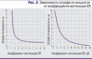 Таким образом, в реальной системе для сохранения требуемого коэффициента BER при фиксированном верхнем уровне Р1 и нижнем уровне Р0, отличном от нуля, пороговое значение мощности должно быть увеличено. Отношение порогового значения реальной системы к пороговому значению идеальной системы называют штрафом по мощности (power penalty). Наличие штрафа по мощности сужает доступный динамический диапазон проектируемой системы (рис. 3).