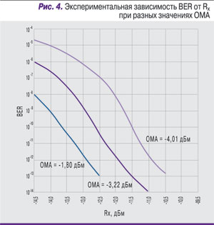 Эксперименты показывают, что величина ОМА прямо влияет на коэффициент BER (рис. 4). Отметим, что с увеличением OMA соответствующая экспериментальная кривая сдвигается влево и доступный уровень оптической мощности для фотоприемника увеличивается (улучшается отношение сигнал/шум). Например, при увеличении OMA с -4,01 дБм до -3,22 дБм мощность детектируемого излучения увеличивается с -10,78 дБм до -11,7 дБм при неизменном коэффициенте BER = 10-12.