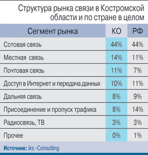На развитии телекоммуникаций сказывается общий неспешный ритм местной жизни, так завораживающий московских туристов. Костромской рынок связи консервативен: доли традиционных услуг – местной телефонии, почтовой связи – на нем выше, чем в среднем по стране (см. таблицу), а доля «новых» услуг ниже.